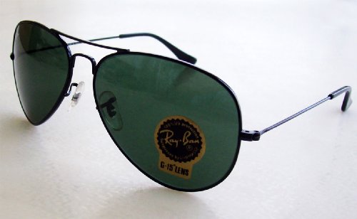 Classic Ray-Ban aviator sunglasses. Black metal frame with gray/green (G15) crystal lenses. Size 55MM.